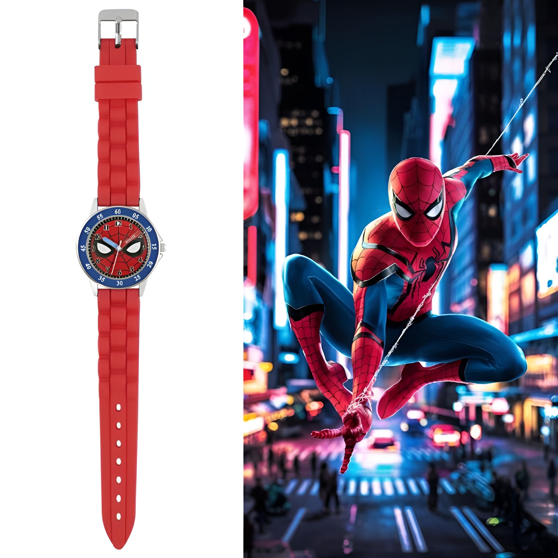 Disney Marvel Spiderman Red Silicon Strap Watch. Featuring a Spiderman dial, easy read numbers and time teacher hands.