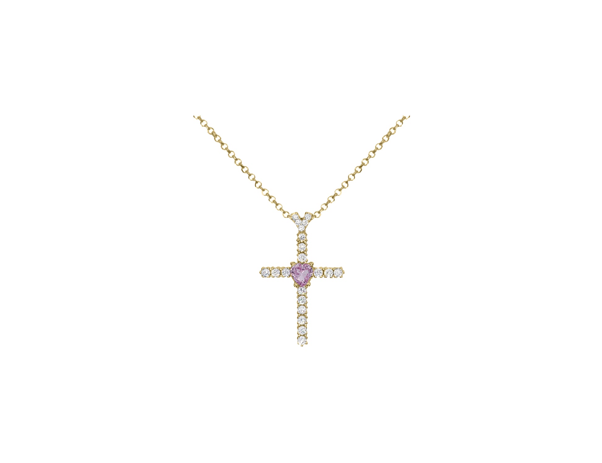 Cross and Heart necklace in yellow gold plated 925 silver with white cubic zirconia and central heart-shaped cubic zirconia in pink colour.
