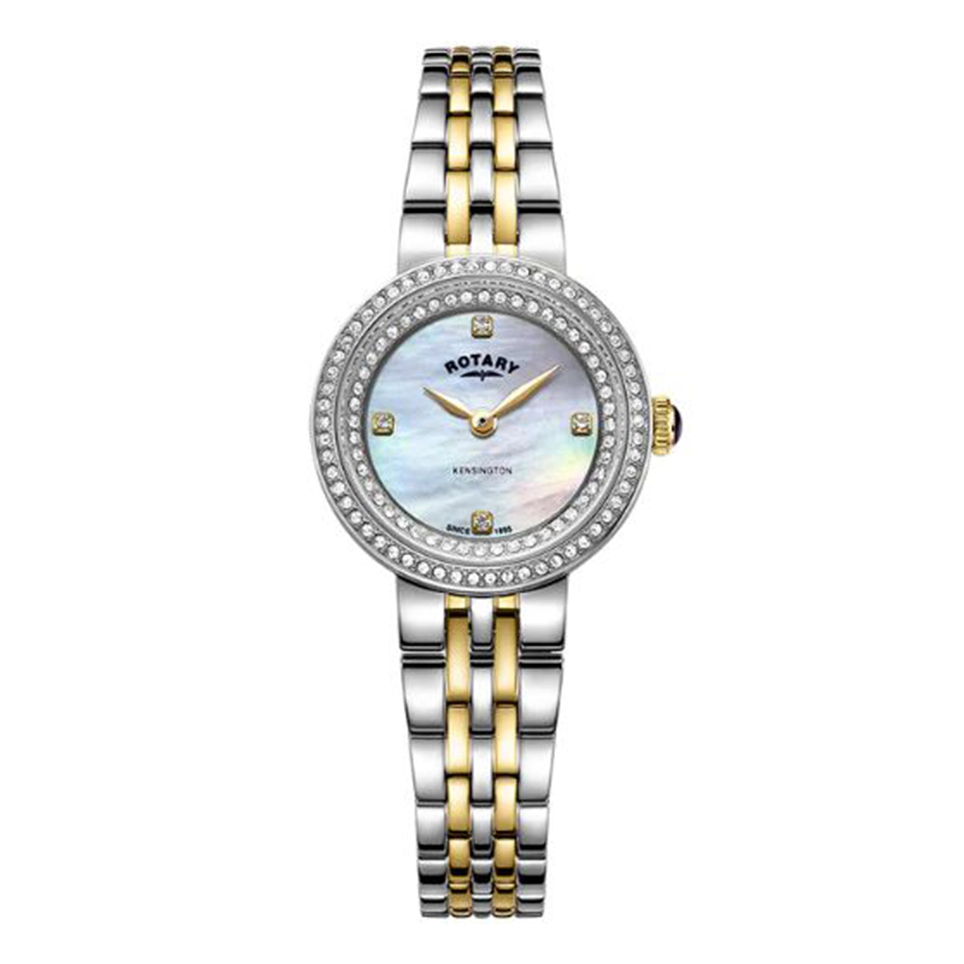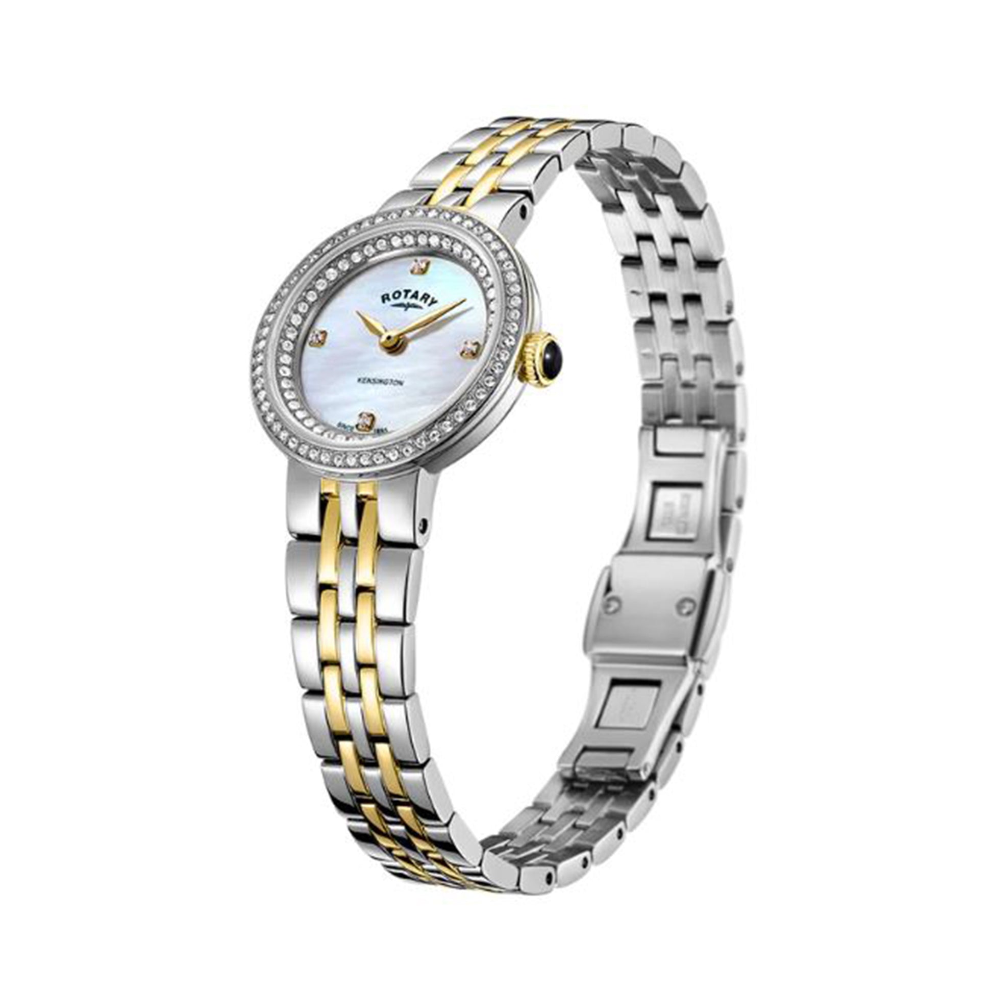 Hosting a myriad of elegant facets, this Rotary Contemporary timepiece achieves the perfect blend of function and beauty, making it the perfect piece of jewellery for a sophisticated woman. What immediately draws the eye is the watch's white mother of pearl dial with outer dial crystals, decorative crown and quarter set crystal markers. Its 25mm two-tone Gold PVD Stainless Steel case holds together a precise quartz movement and sapphire glass, as well as being water resistant to 50m. The two-tone Gold PVD Stainless Steel five link bracelet is secured with a deployment clasp.
