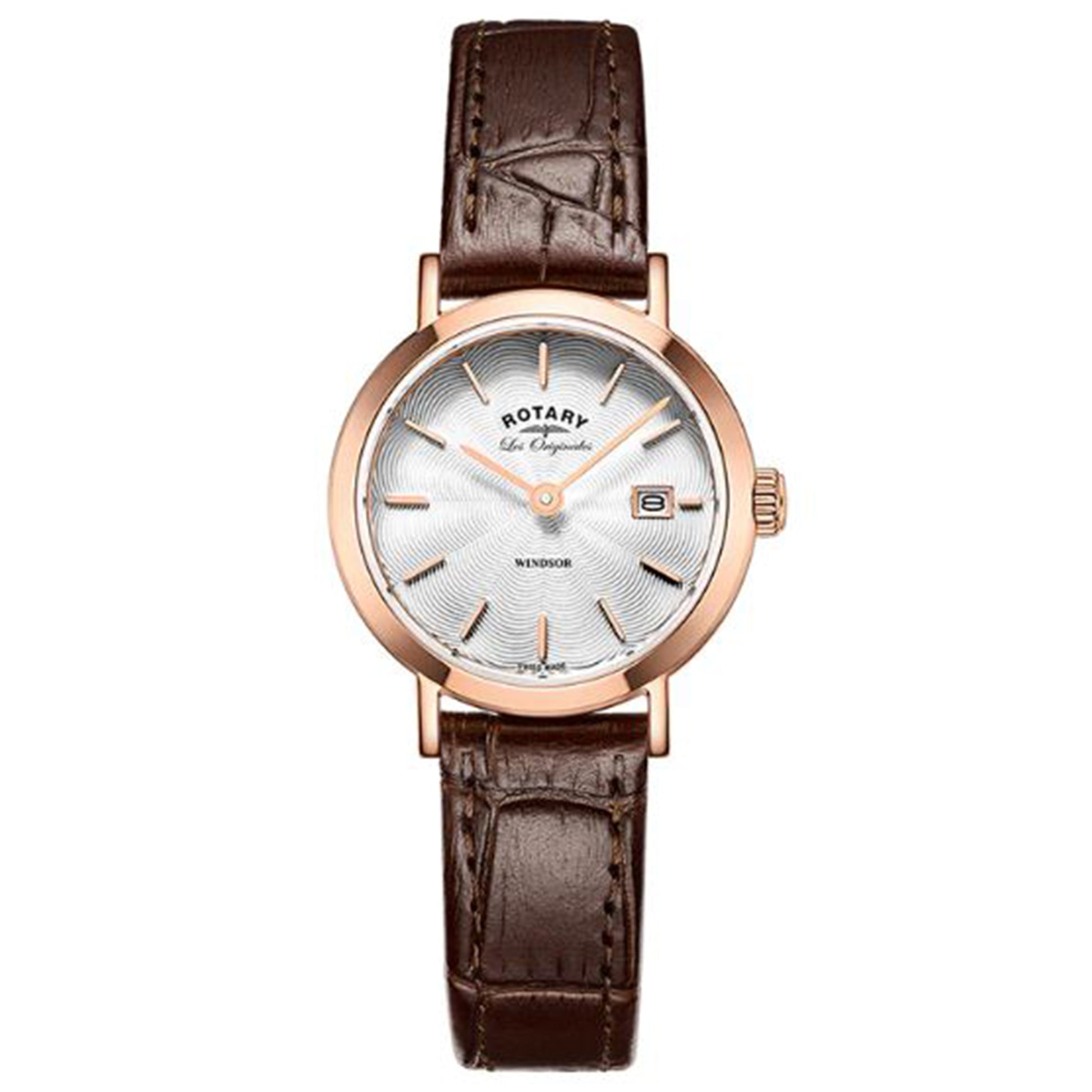 The Ladies Windsor Swiss watch is classic in its simplicity and elegance. The Rose Gold PVD case and stunning white dial are perfectly proportioned, and the look is completed by a brown alligator effect leather strap. For longevity and accuracy, the watch uses a Swiss Ronda movement. The Windsor range is water resistant so you can shower, swim and snorkel with confidence.