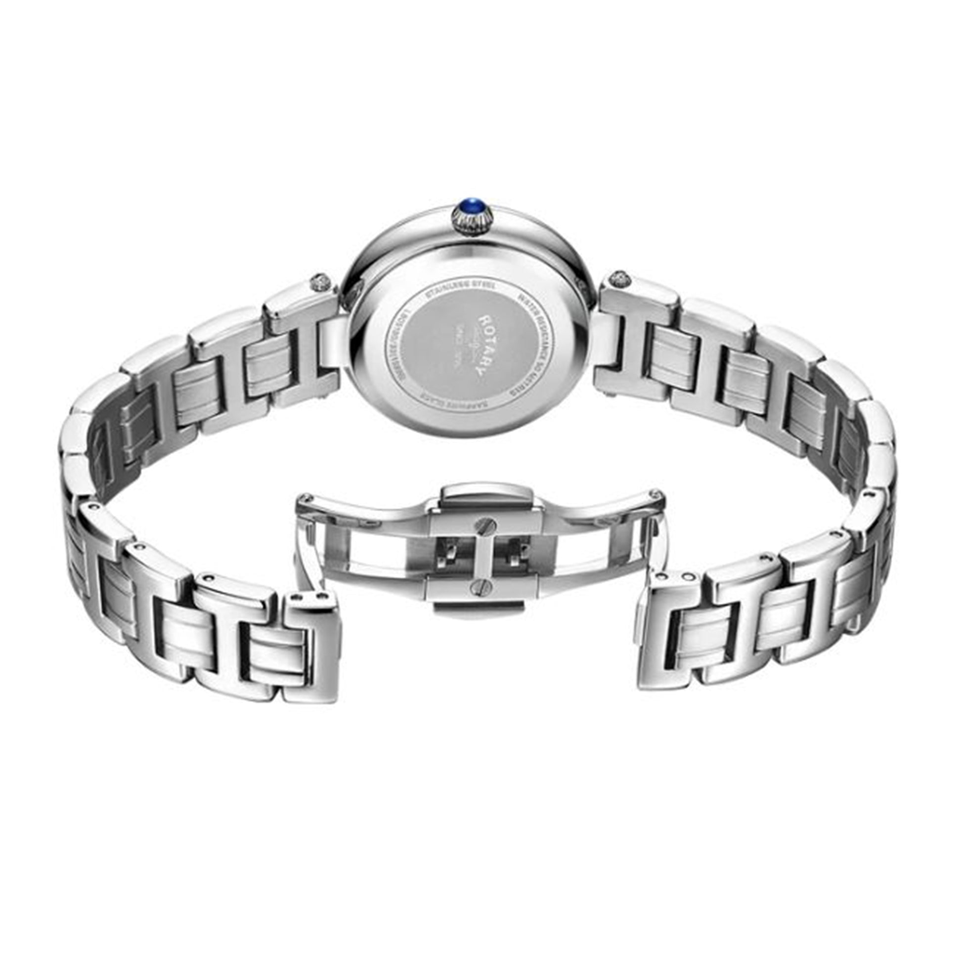 This detailed Rotary Traditional watch is for those who enjoy integrating a bit of glamour into their wardrobe. Featuring a sparkling pave dial, this statement timepiece is set with over 260 Austrian Crystals and bright blue hands that are shielded by scratch resistant sapphire crystal. Each carefully crafted watch within the collection is powered by a quartz movement and housed in a 28mm polished case. The H link Stainless Steel bracelet showcases ornate decorative screws and deployment clasp. Water resistant to 50m this watch, this creation is feminine and functional.