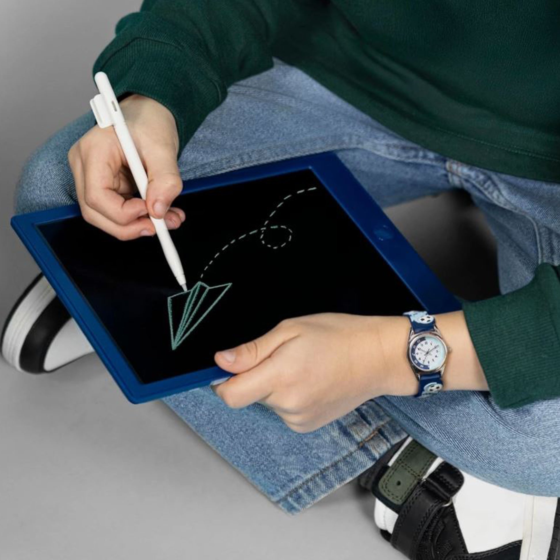 The 3D football strap watches offer an easy-to-read design perfect for young timekeepers. The 24mm watch features a specially designed time teacher dial, developed to help kids learn to tell the time with confidence. The soft silicone strap is comfortable to wear and easily adjustable to fit a variety of wrist sizes. The set includes the Tikkers football print endless drawing pad, the prefect sketch pad for children to doodle, play games and practice writing. A magnetic pen attaches to the tablet and can easily be pulled out to draw and write directly onto the writing area. You can then clear and store your artwork creations with the push of a button.